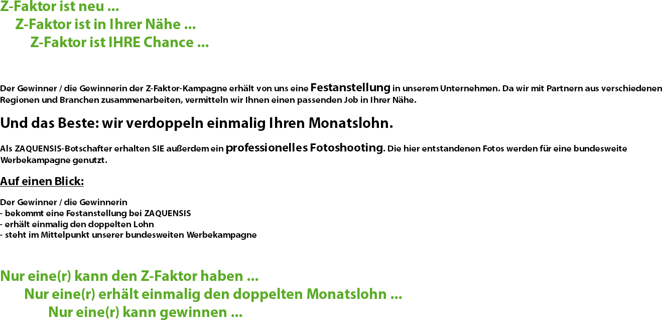 Z-Faktor ist neu ... Z-Faktor ist in Ihrer Nähe ... Z-Faktor ist IHRE Chance ... Der Gewinner / die Gewinnerin der Z-Faktor-Kampagne erhält von uns eine Festanstellung in unserem Unternehmen. Da wir mit Partnern aus verschiedenen Regionen und Branchen zusammenarbeiten, vermitteln wir Ihnen einen passenden Job in Ihrer Nähe. Und das Beste: wir verdoppeln einmalig Ihren Monatslohn. Als ZAQUENSIS-Botschafter erhalten SIE außerdem ein professionelles Fotoshooting. Die hier entstandenen Fotos werden für eine bundesweite Werbekampagne genutzt. Auf einen Blick: Der Gewinner / die Gewinnerin